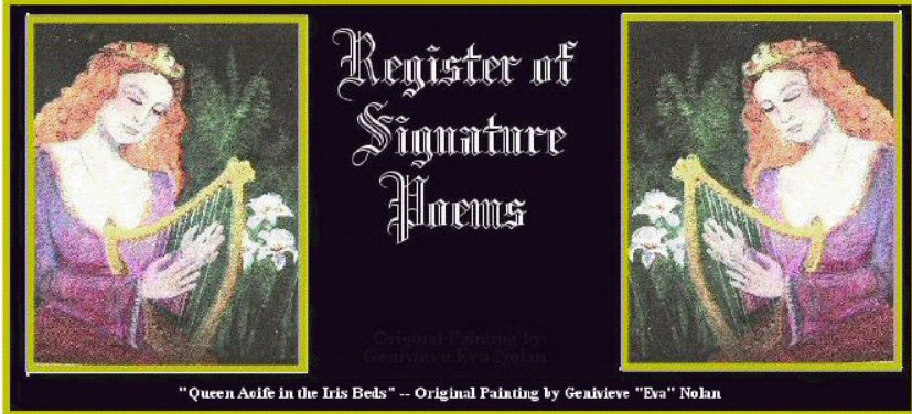 You may display your own Signature Poem for the lifetime of this website for just one $10 service fee. Submit one poem and tell us where you were born, what your chief profession is or was, and where you now live. Include street address, e-mail address and phone for our records, but not for publication. If you send your bio and poem by e-mail, use “SIG POEM” in the subject line. Or, send by snail mail with your $10 check payable to Wanda Sue Parrott Literary Fund. Mail to “Registry,” P. O. Box 1821, Monterey, CA 93942. Spell your name and/or pen name exactly as you want it to appear. As soon as we receive your check, your posting will be activated.