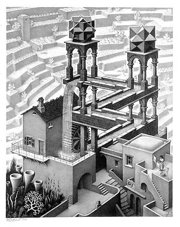 The Waterfall (1961) by M. C. Escher (1898-1972). The primary institutional collections of original works by M.C. Escher are the Escher Museum, a subsidiary of the Haags Gemeentemuseum in The Hague; the National Gallery of Art (Washington, DC); the National Gallery of Canada (Ottawa); the Israel Museum (Jerusalem); Huis ten Bosch (Nagasaki, Japan); and the Boston Public Library. (Excerpted from Wikipedia.) |