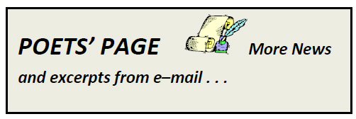 After Super Storm Sandy, followed by a nor’easter, hit the East Coast in November, we e-mailed all our poets near the Atlantic to see how they fared. All survived. ROGER FINCH, Cape Neddick, Maine: During Hurricane Sandy, we had a house-guest here whom we knew when we were living in Tokyo, Japan. She lives in London now. . . . Our lights flickered a few times, as we prepared to eat a cold meal, but there was no power outage of any length. Our English friend rather enjoyed all the excitement and we joked that we had arranged this pageant just for her enjoyment . . . Regards to all of you, CAROL LEAVITT ALTIERI, Madison, Connecticut I only lost many branches and limbs in our sanctuary and the internet, cable, phone and electricity for two days. My heart was palpitating and my brain burning as I remained in our house but I planned to move to the basement if any windows broke or if a tree fell on the house. JANE GALLAGHER, Glen Burnie, Maryland The rain was like going through a car wash and never coming out. The wind never rested. My heart goes out for all those affected. . . My first writing since winning the (Maryland) Senior Poet Laureate award is a card for the returning troops, titled "Standing Tall". I plan to continue greeting our troops, and let them know my appreciation for their service through my words. JEAN CALKINS, Waynesville, North Carolina We are inland, near the TN border, so Sandy was kind to us--just a day of rain, which we needed anyway. Did a lot of praying for those who lost so much. . . Pleased to have won a 3rd in FL State poetry competition, but really shocked at IN State Fed. of Poets who gave me not only a 1st, but 5 HMs! Have a wonderful holiday season! MORE LITER—ETCETER--ATA HENRY GREENFIELD’s new novel Desperate Conspiracy is available at greenfie@hotmail.com (Autographed) or Amazon.com and its Kindle Store. Explore the Middle East in a memorable action/adventure story. $15.00; 20 percent discount for repeat customers. MICHAEL WELLS: Come read my Paper.li newspaper Stickpoet’s Poetica… From around the internet: poetry, writing, cultural news and stories. Now you need only one source. Copy and paste this invitational link in your browser’s address bar and then click go/search: . :http://paper.li/stickpoet/1349560536?invitation_id=317a2 156-8734-4ba7-aa7c-cf8829e95ebc# |