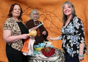 Delane “Pocahontas” Parrott (left) and Vera-Jane “Little Dove” Goodin Schultz (right) were named Honorary Chiefs of the Weeping Waters White Buffalo Lodge following the powwow. They pose here at the closing-ceremony table from which each participant selected a keepsake pea-gravel pebble from Wanda Sue Parrott’s (center) Weeping Waters home/office. Delane “Pocahontas“ catered the feast, assisted by Vera-Jane “Little Dove“ (wife of photographer John “Eagle Eye” Schultz). Delane and her husband Charles “Moon Driver” Parrott made or decorated powwow artifacts, including drums, the “death rattle gourd”, flute played by Jessica Quin, and hand-tooled leather “Trail of Tears” map in the background. Delane is a talented party-giver/caterer whose prices are affordably magic. Contact: Parties by Parrott, delaneparrott@sbcglobal.net. LAST TEARDROPS ON THE TRAIL OF TEARS AWARD