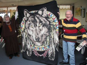 Each participant received a turquoise foam teardrop handcrafted by Delane Pocahontas Parrott on which to write his or her name. One name was drawn from the Last Teardrops on The Trail of Tears Award basket for a surprise door prize at the conclusion of the powwow: the colorful fleece blanket bearing the image of Wayah a (Wolf in Cherokee), also known as The Watcher, which served as a table centerpiece. In traditional aboriginal dream interpretation, the wolf was/is a universal symbol in which the spirit of the animal is a guide. It leads the individual to whom it appears toward the path of righteousness, fairness, strength, understanding and enlightenment. Wayah--pronounced Wah-yah--is a teacher. So was Wayah’s winner. Tom Withers, past president of Springfield Writers’ Guild, was a school psychologist in California before retiring in Missouri. The universal symbolism of the Wayah blanket extends into the modern-day world of international business. The prize Native American Indian blanket was made in China!